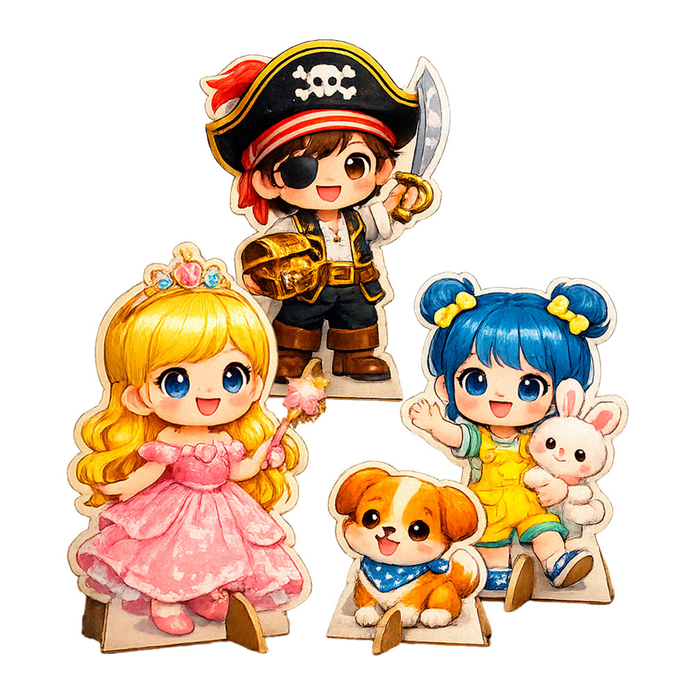 Cada peça é cortada no formato da arte e acompanha suporte traseiro fixo, permitindo que o totem permaneça em pé sobre mesas, balcões ou prateleiras. É uma alternativa versátil para complementar cenários de festas, destacar marcas em pontos de venda ou criar elementos decorativos personalizados.